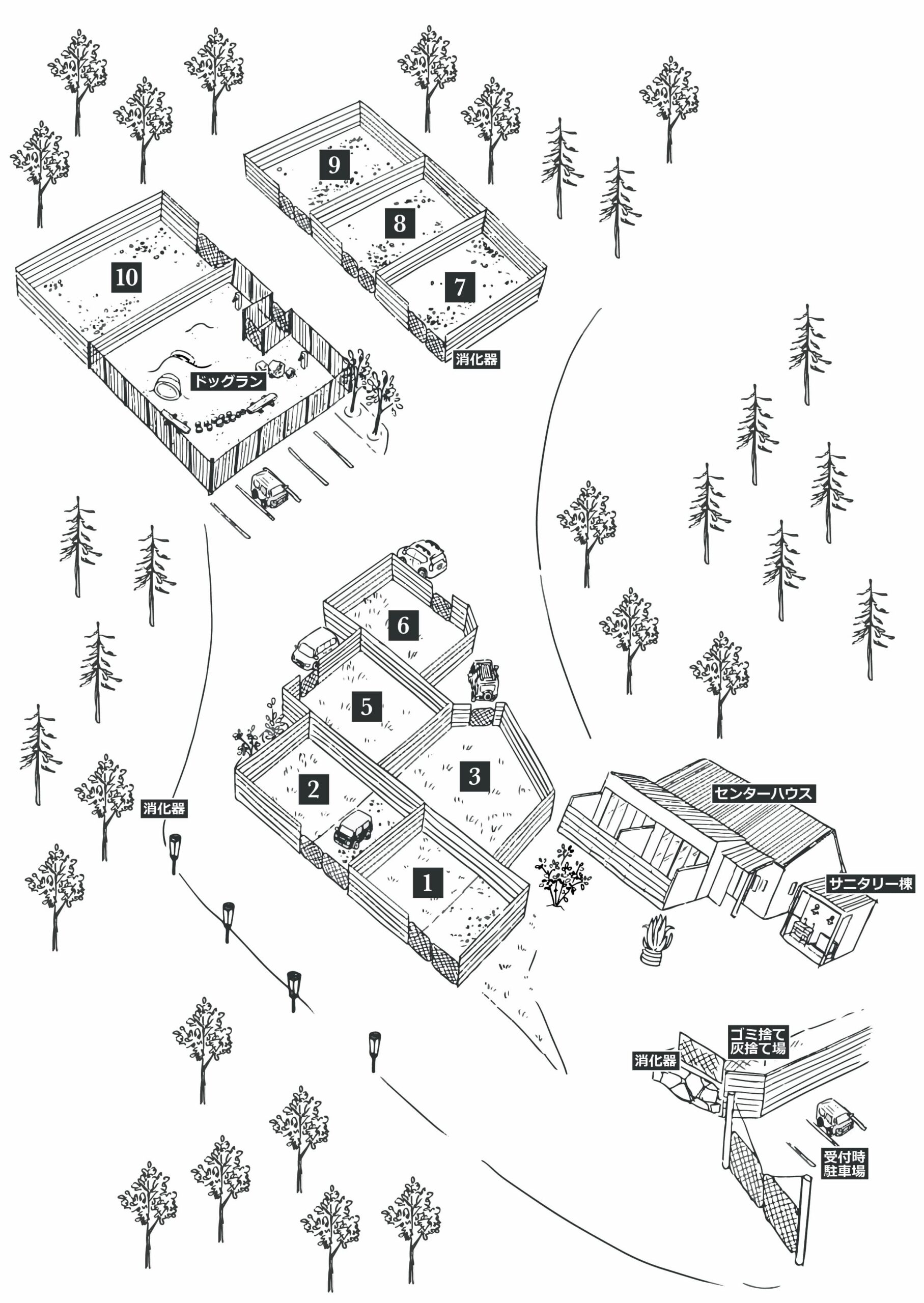 当キャンプ施設では、お客様の好みやニーズに合わせて選べる3種類のサイトをご用意しています。全てのサイトは150m²以上の広さを誇り、1.2mの木柵で囲まれたプライベート空間を提供します。場内には5mの道路があり、ドッグランやサイト内でのノーリードが可能なため、ワンちゃんを連れてのご利用も安心です。人数、テント、タープの制限はなく、ワンちゃんがいないお客様もご利用いただけます。天然芝、砂利、デッキの各サイトで、自然を身近に感じながら、快適で自由なキャンプライフをお楽しみください。